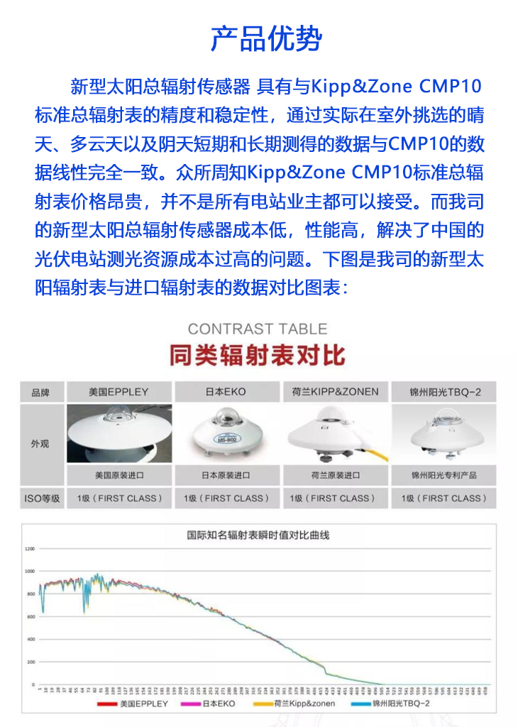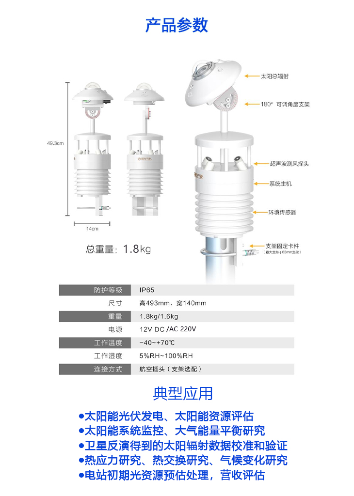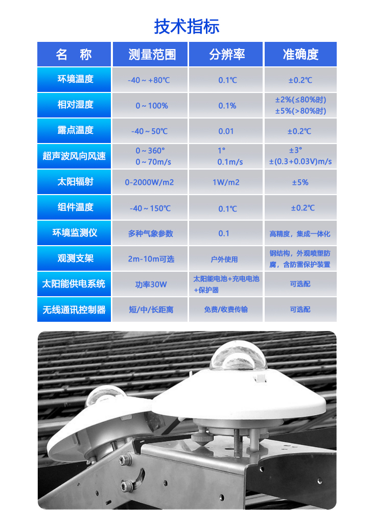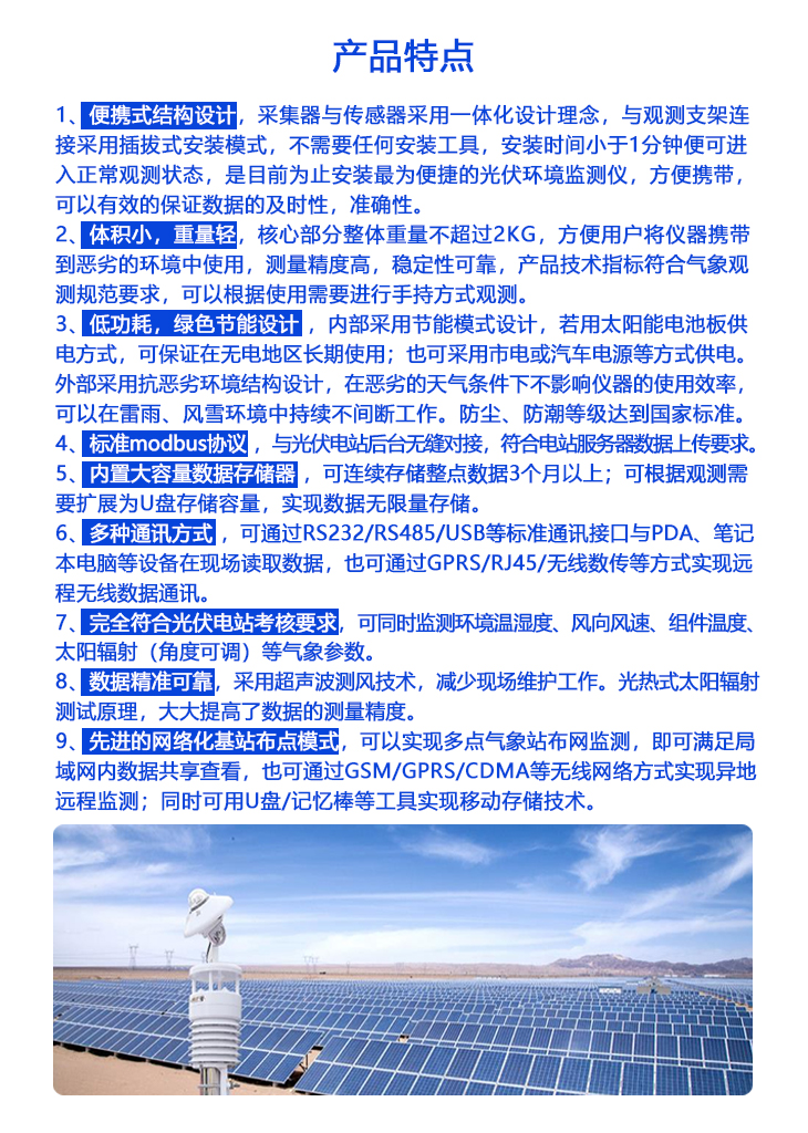 本產(chǎn)品是針對光伏發(fā)電站研發(fā)生產(chǎn)的一款最新型一體化光伏環(huán)境監(jiān)測儀,該設(shè)備采用新型一體化結(jié)構(gòu)設(shè)計,測量精度高,安裝使用方便,可采集多種要素:含太陽輻射(水平/斜面)、溫度、濕度、風速、風向、大氣壓力、背板溫度等要素,要素可按需定制。