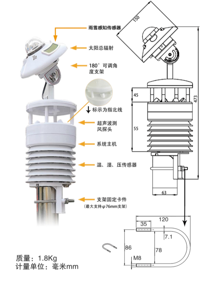 1. 新型一體化結(jié)構(gòu)設(shè)計(jì):設(shè)備采用一體化結(jié)構(gòu)設(shè)計(jì),集成了太陽(yáng)輻射、溫度、濕度、風(fēng)速、 風(fēng)向、大氣壓力、組件溫度,天氣狀況等多種傳感器,實(shí)現(xiàn)了多種環(huán)境要素的同步監(jiān)測(cè)。同時(shí),設(shè)備支持按需定制,可根據(jù)用戶(hù)需求增加或減少監(jiān)測(cè)要素。