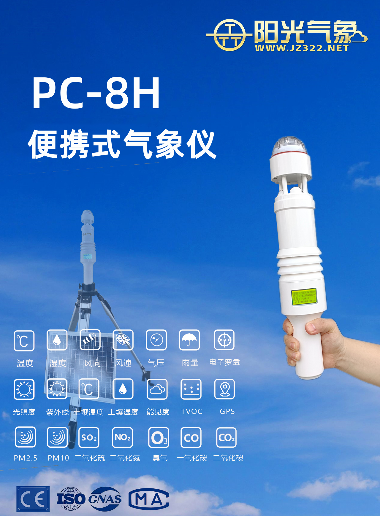 PC-8H是一款設計精巧的便攜式氣象儀,支持環境溫度、濕度、氣壓、風速、風向、海拔、露點、風寒指數、熱應力指數、太陽輻射、光照度、紫外輻射、雨量、PM2.5、PM10、CO2、能見度、土壤溫濕度及空氣質量參數等氣象數據,整體設計融合了人體工學及軍事氣象的苛刻要求,采用了模塊化、固態化、數字化傳感器理念,重塑了傳統自動氣象站的外觀結構,并在整機防護性和耐用性上取得了巨大突破,全金屬材質使該款產品可以長期暴露在戶外,不受惡劣天氣狀況影響,高度集成的電子電路設計使小巧的體積下蘊含了傳統設備數倍重量的功能,為氣象觀測戶外作業帶來了更多方便。這款產品可廣泛應用在農林業,航空航海,車載觀測,應急救援,軍事氣象,現場移動氣象觀測等各個領域。